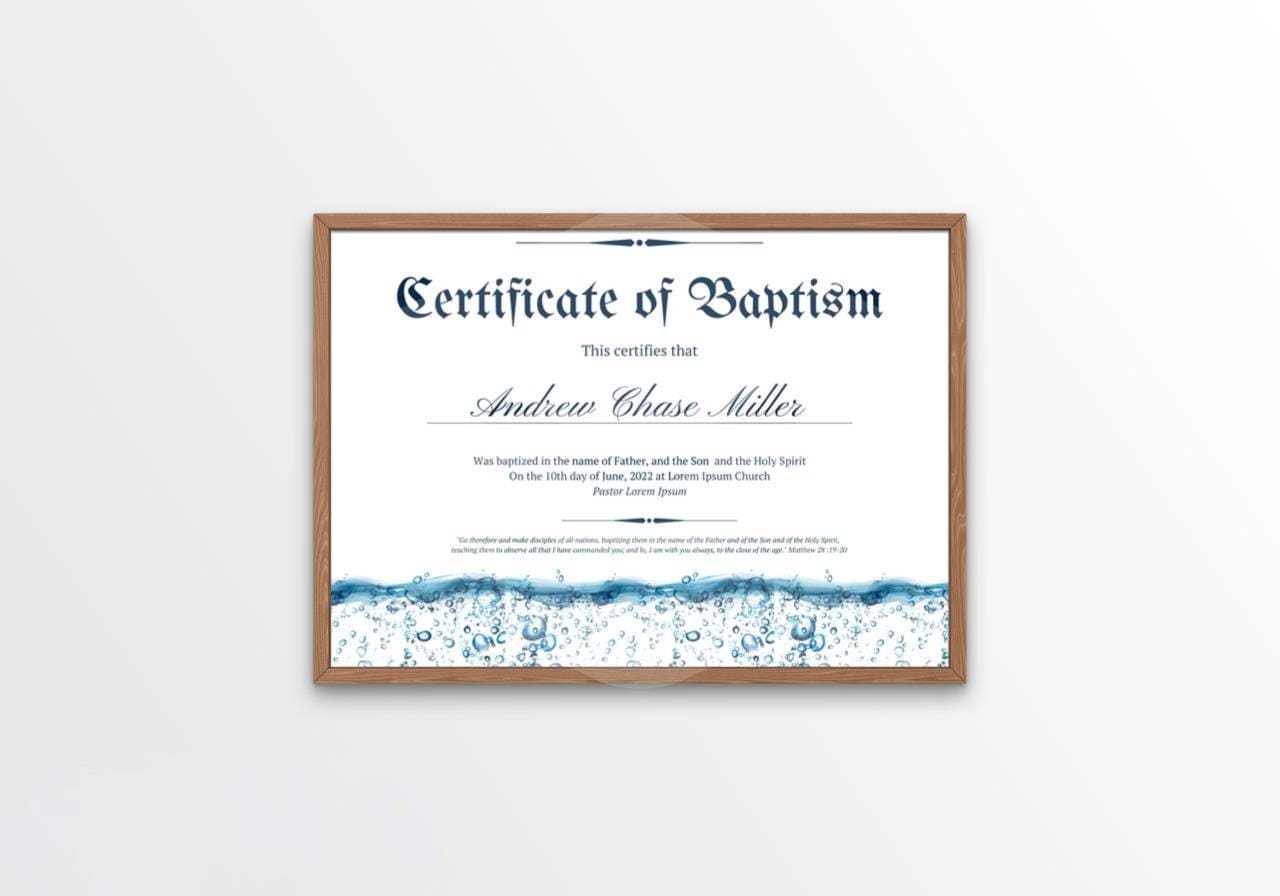 Free Water Baptism Certificate Template - Remember the special occasion of baptism with kittl's free baptism certificate templates. Create a cherished baptismal certificate to commemorate this spiritual journey. A baptism certificate is a document that provides information regarding a person being baptized. Free printable and editable baptism certificate templates that you can customize online before you print. Template.net helps your church easily create an official document.